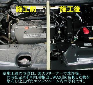 エンジンルームの清掃で見えない所にもこだわりを 専用クリーナーですっきりツヤ出しもできる Cobby